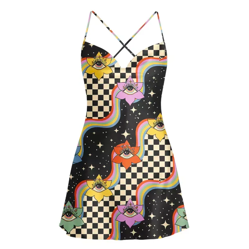 Ifthesummerof 2026 had a visual anthem, the Checkerboard Cosmic Eye Dress would be it. Its black‑and‑cream checker pattern breaks in waves of kaleidoscopic colour bursts — each layer featuring the All‑Seeing Eye motif that evokes freedom, intuition, andspiritual light. Fitted around the bust with criss‑cross spaghetti straps, it’s equal parts playful and provocative.