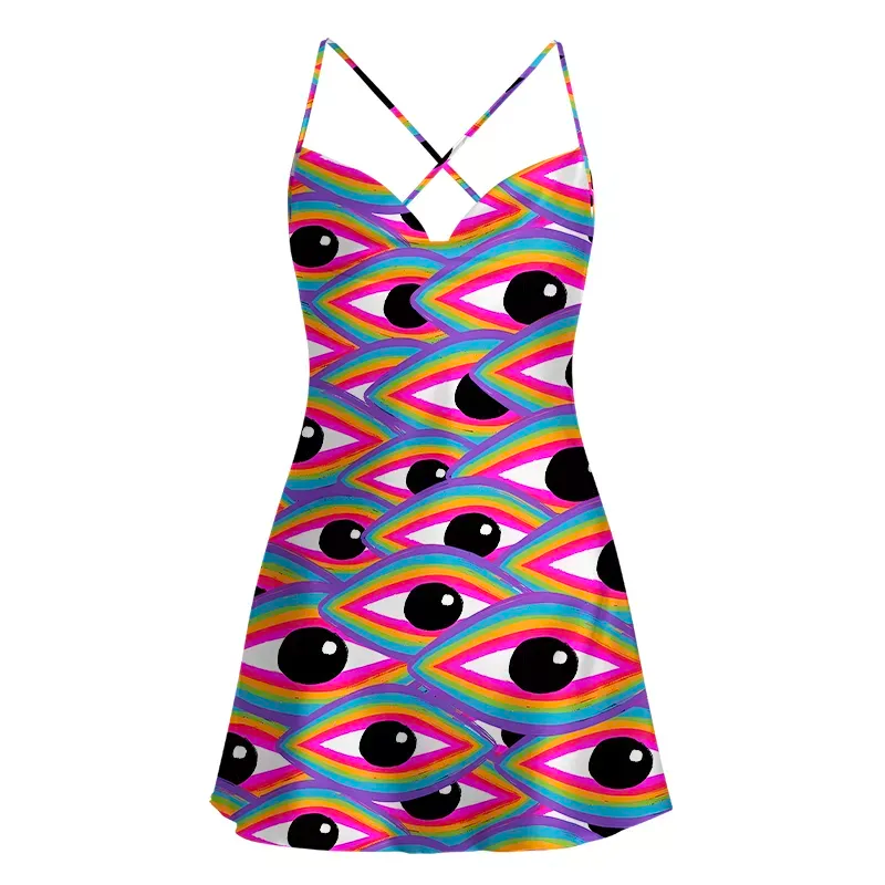 For those who live loud and love colour, the Chromatic Vision Mini Dress is a psychedelic explosion of rainbow hues and repeating eye motifs. Layer upon layer of vivid pink, fuchsia, yellow, and cyan create a hypnotic effect that can only be described as audacious confidence. The strappy design highlights the shoulders while the smooth fabric glides along the skin like liquid light.